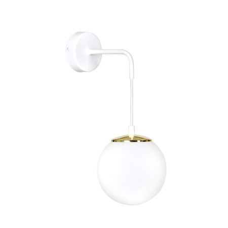 Kinkiet Emibig OGNIS K1 WHITE 967/K1 to eleganckie oświetlenie ścienne z białą metalową konstrukcją, elementem złota, szklanym białym kloszem w formie kulki i regulacją długości, które dodaje wnętrzu nowoczesności i subtelnej atmosfery.