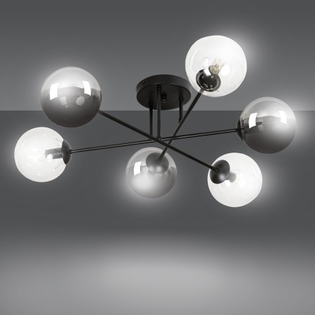 Emibig BRENDI 6B BL/MIX 3 EM834/6B3 to stylowa lampa przysufitowa z czarnym metalowym korpusem, sześcioma szklanymi kloszami w formie kuli o dwóch różnych kolorach (transparentny, grafitowy), doskonale łącząca nowoczesny design z funkcjonalnością, idealna do nadania wnętrzu eleganckiego i wyrazistego charakteru.