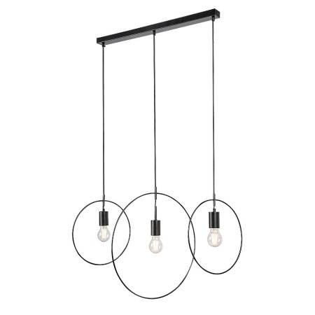 Industrialna lampa wisząca Dilara z trzema punktami świetlnymi to propozycja dla osób poszukujących purytańskiego, a zarazem oryginalnego rozwiązania oświetleniowego do nowoczesnego salonu. Wykonana w całości z metalu i wykończona w matowej czerni, lampa posiada dwa małe i jeden duży element w kształcie pierścienia otaczające źródła światła. Głowice są połączone z dekoracyjną podstawą za pomocą tekstylnych przewodów i umieszczone obok siebie na różnych wysokościach. Oprawę Dilara można zamontować na suficie za pomocą długiej, prostokątnej dekoracyjnej podstawy i stosować z trzema źródłami światła o mocy do 40 W każde. Gwint: E27. Do tej lampy wiszącej polecamy źródła światła o barwie naturalnej bieli, które tworzą jasny, nowoczesny efekt w salonie. Wymiary oprawy Dilara to: szerokość 860 mm, lampa wisząca 1500 mm, głębokość montażu 600 mm. Oprawa jest dostarczana bez źródeł światła.