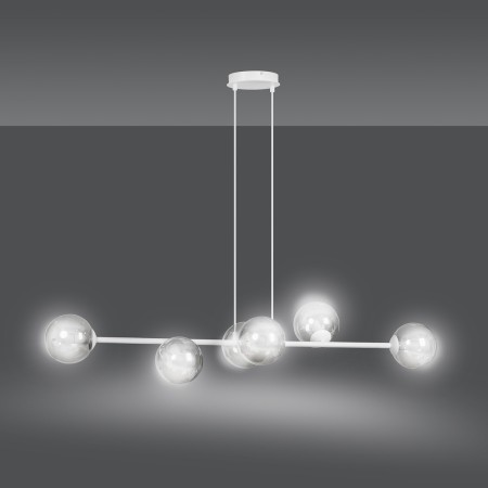 Lampa Emibig ROSSI 8 EM878/6 to elegancka metalowa biała lampa z 8 szklanymi kloszami w formie kul, oferująca regulowana wysokość i nowoczesny akcent oświetleniowy do wnętrz.