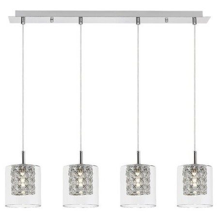 Nowoczesna i elegancka lampa wisząca Duchess z 4 żarówkami będzie efektownym dodatkiem do salonu, jadalni lub sypialni. Wykonana z chromowanego metalu, lampa posiada przezroczyste, cylindryczne klosze, które pozwalają podziwiać piękne kryształowe zdobienia wewnątrz. Cztery klosze, wiszące obok siebie, osadzone są na długiej, kwadratowej, ozdobnej podstawie. Lampa Duchess wymaga czterech żarówek o mocy do 40 W każda. Gwint to G9. W zależności od preferencji, do tego modelu można wybrać ciepłe lub naturalne białe światło. Jeśli lampa ma być umieszczona w sypialni, zalecamy użycie żarówek emitujących ciepłe, białe światło, które z pewnością pomoże stworzyć przytulną, intymną atmosferę. Wymiary lampy wiszącej Duchess z 4 żarówkami są następujące: szerokość 720 mm, wysokość każdej głowicy 120 mm, odległość od sufitu 1200 mm. Model sprzedawany jest bez żarówek.