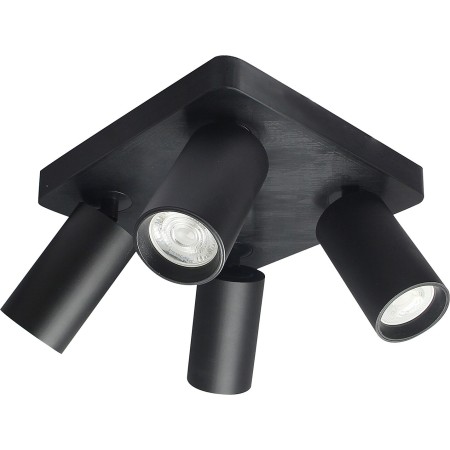 Reflektor sufitowy Rabalux Yorli z czterema źródłami światła polecany jest osobom, które oprócz nowoczesnego wyglądu stawiają na efektywność świetlną. Czarny reflektor posiada aluminiową ramę i cylindryczne klosze z tworzywa sztucznego, a jego montaż do sufitu odbywa się za pomocą kwadratowej, dekoracyjnej podstawy. Głowice lampy umieszczone są w czterech rogach kwadratu i można je indywidualnie regulować, co pozwala na odpowiednie ukierunkowanie strumienia światła. Cztery źródła światła gwarantują efektywne oświetlenie całego pomieszczenia. Ten reflektor sufitowy polecany jest przede wszystkim do salonów, sypialni i korytarzy. Można w nim stosować cztery żarówki o mocy do 7 W każda. Typ trzonka: GU10. Lampa czteropunktowa jest dostarczana bez źródeł światła.