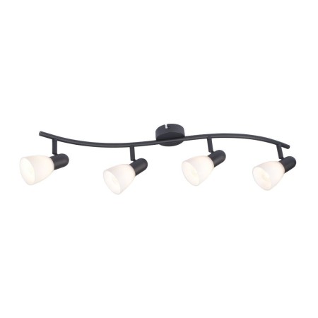 Reflektor sufitowy Rabalux Soma z czterema źródłami światła polecany jest osobom, które chcą skutecznie oświetlić przestrzeń życiową dobrze ukierunkowanym strumieniem światła. Ten elegancki model idealnie sprawdzi się w salonie, jadalni, korytarzu lub sypialni. Reflektor wykonany jest z metalu, ma czarną ramę i białe, szklane klosze w kształcie litery A. Można go zamontować na suficie za pomocą małej, okrągłej, ozdobnej podstawy. Głowice lampy są ułożone w jednej linii, obok siebie, na zakrzywionym wsporniku przymocowanym do ozdobnej podstawy i można je indywidualnie regulować dzięki zintegrowanemu przegubowi kulowemu. Strumienie światła, które można dowolnie kierować, zapewniają doskonałe oświetlenie pomieszczenia. Czteropunktowa lampa jest przeznaczona do czterech żarówek o mocy do 40 W każda. Typ trzonka: E14. Model dostarczany jest bez źródeł światła.